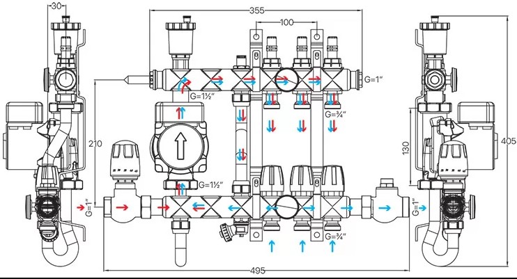 Колектор Koer використовується у системах теплої підлоги, радіаторного опалення та змішаних системах, де необхідно підтримувати стабільну температуру подачі. Оптимально підходить для житлових, офісних та промислових об’єктів.
