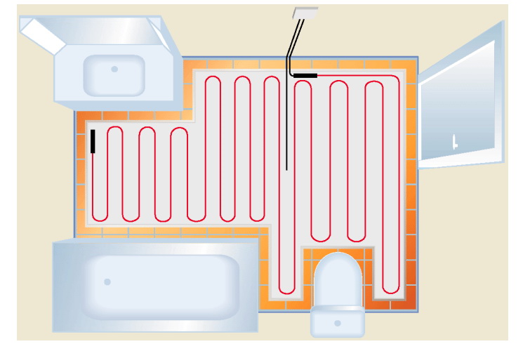 Для складання схеми укладання на загальному кресленні приміщення закреслюємо ті ділянки, на яких будуть розміщуватись сантехнічні прилади та стаціонарні меблі (шафи, тумби, пральна машинка). Вказуємо на схемі габарити вільного простору. Не забуваємо про відступи від стін та меблів по всьому периметру (min 5 см) та між витками кабелю (5-10 см). Крок укладання розраховується як відношення площі укладання до довжини кабелю. Виберемо місце для терморегулятора та підводимо до нього живлення.