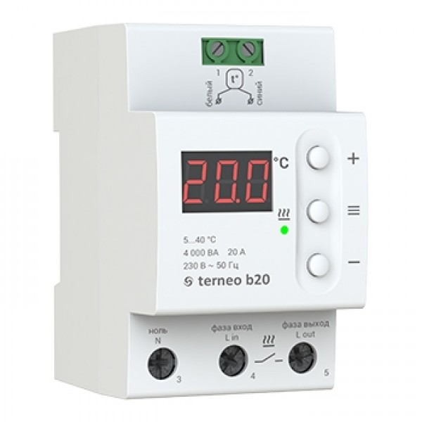 Терморегулятор тернео b20 предназначен для управления системой теплый пол. Устанавливается на ДИН-рейку. Данная модель отличается своей надежностью, так как может использоваться при повышенной мощности электрической сети. Ему не страшны никакие скачки электроэнергии. Отлично подойдет для отопления частного дома или производственного помещения.